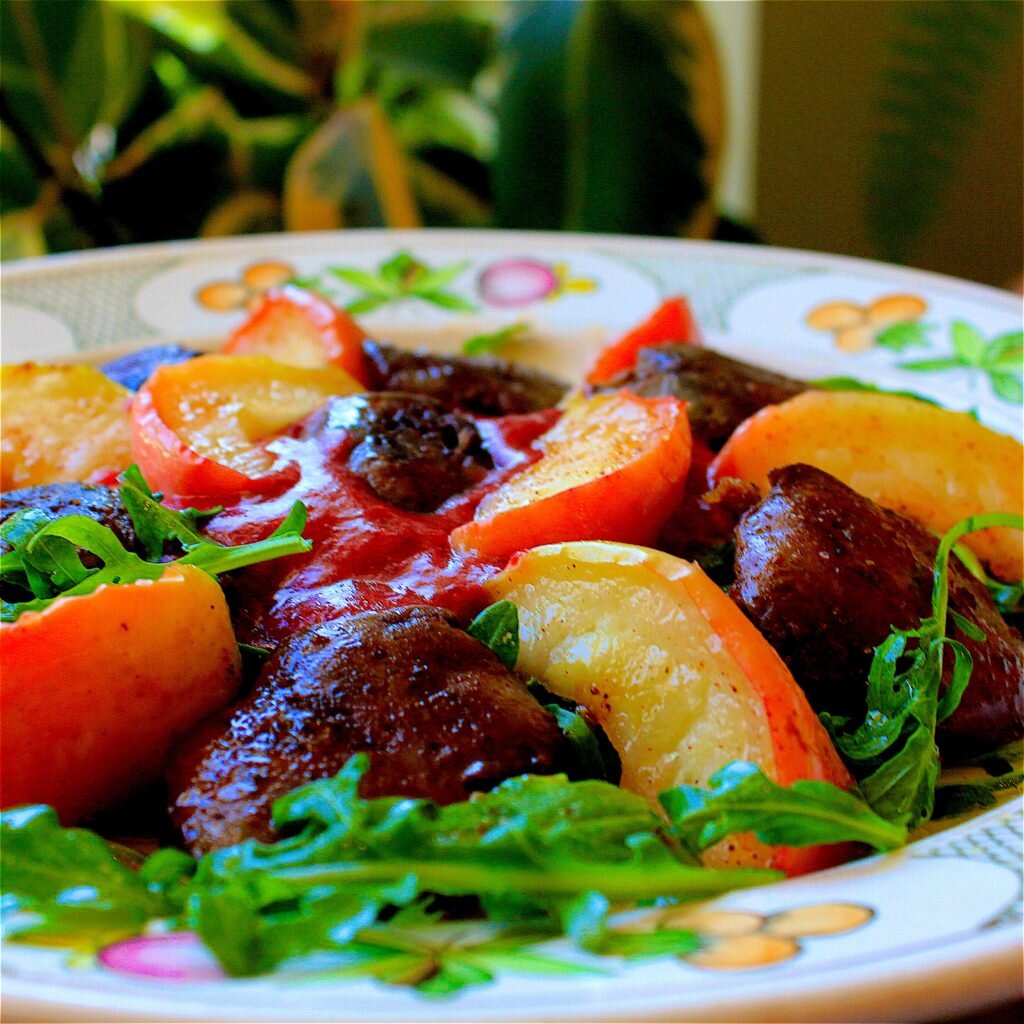 Время приготовления: 20 мин. Порция: 2 шт. Нам понадобится: Способ приготовления: Печень вымойте и обсушите на бумажном полотенце. Обжарьте на сковороде с оливковым маслом на сильном огне, по 1 — 2 минуты с каждой стороны. Затем убавьте огонь, накройте крышкой сковороду и тушите 5 — 10 минут. Салатные листья вымойте, обсушите, выложите на блюдо, полейте заправкой из смеси бальзамического уксуса, оливкового масла и сока лимона. Сверху выложите печень и сливы без косточек, нарезанные на четыре части. Посыпьте зеленью. Приятного аппетита!