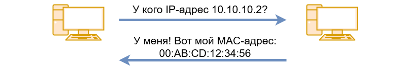 Первый компьютер отправляет broadcast сообщение всем в широковещательном домене с запросом “У кого IP-адрес 10.10.10.2? Если у тебя, то сообщи свой MAC-адрес” и на что компьютер с этим адресом сообщает ему свой MAC.