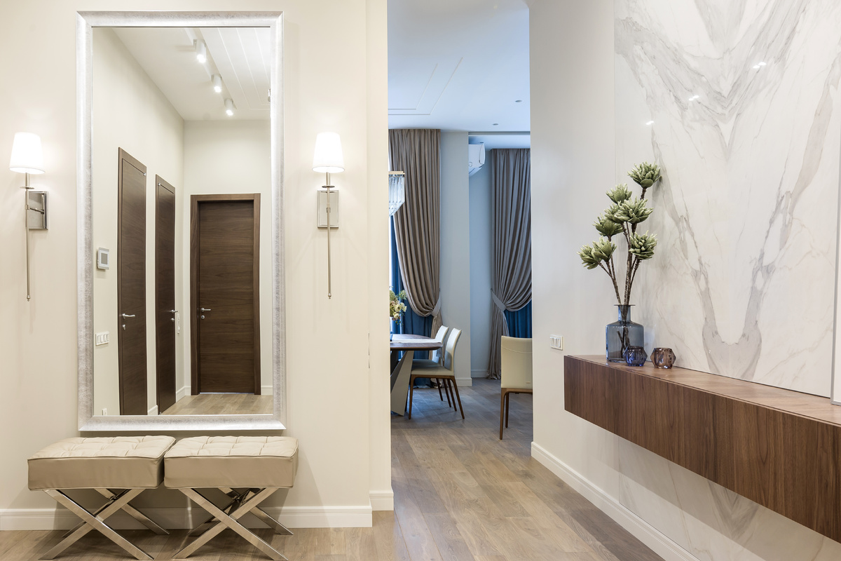 Новый ар-деко или Прикосновение роскоши Интерьер просторной квартиры исполнен в классическом стиле с элементами современного дизайна. Минималистичная мебель, традиционная цветовая гамма, благородный оттенок паркета, дверей и стен, богатый текстиль и фактуры природных материалов в отделке создают прочную основу композиции. В то же время в пространстве присутствует ультрамодная глянцевость, которая привносит в интерьер черты стиля ар-деко. Тонкий керамогранит с зеркальной поверхностью, имитирующий шлифованный камень, использован в декоре стены и кофейных столиков. Фактура полированного дерева присутствует в фартуке лаконичного кухонного гарнитура. Хром – в основании светильников и журнальных столиков. Композиция интерьера гостиной выверена и строится на знаковых вещах с простыми формами и нейтральным оттенком – прямолинейном кухонном гарнитуре, диване и системе хранения. Обеденная группа, малые формы мебели и объемные панно гармонично наполняют пространство. Расставленные дизайнер