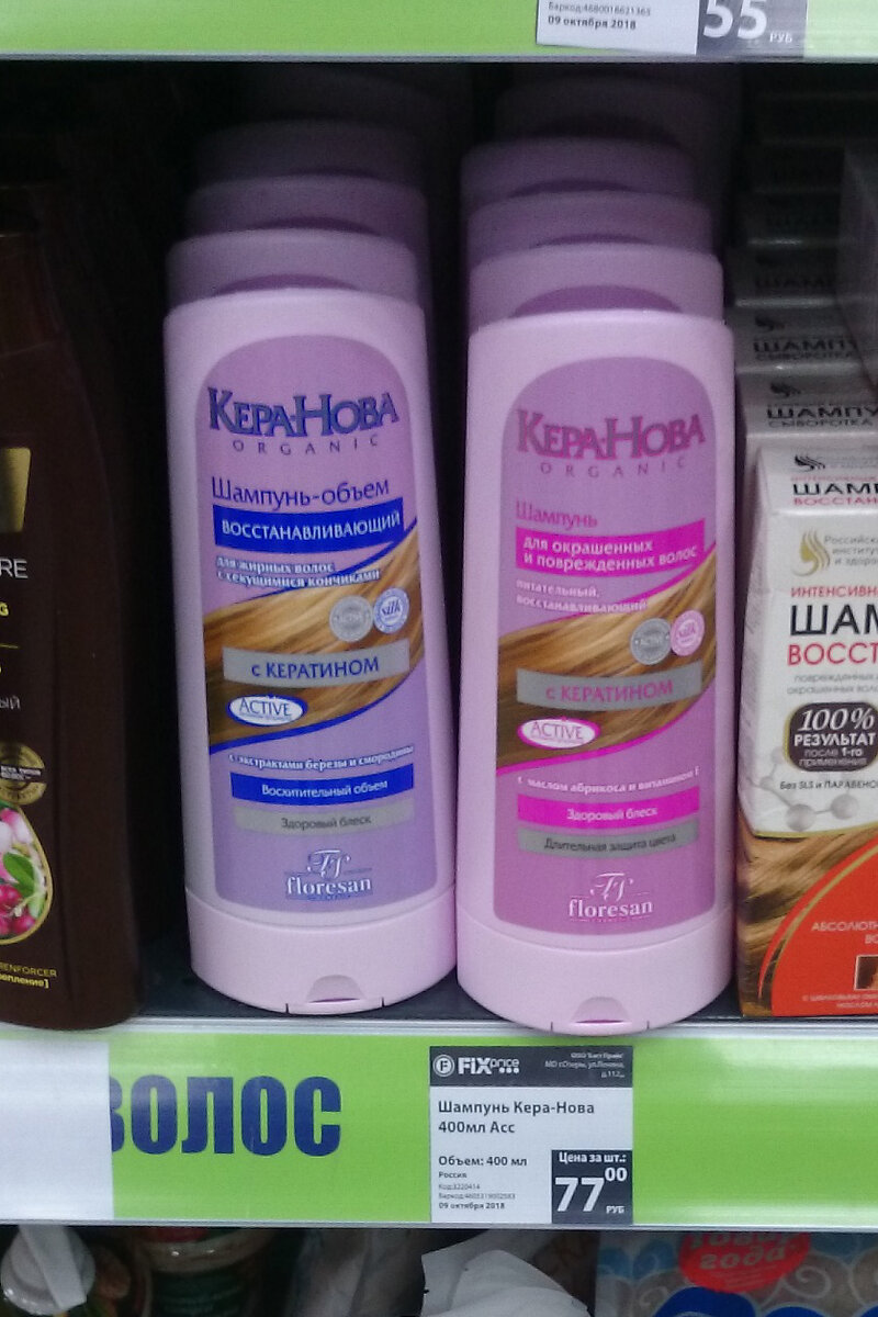 Я снова в Фикс Прайсе и нашла там много интересных товаров. Кое-что купила, но к сожалению все купить я не могу, поэтому хочу поделится с вами интересными вещами из этого магазина, что остались на полочках. А появляется там много всего нужного и полезного и как всегда по вполне бюджетной цене. Начну в шампуней. Подсела я последнее время на тесты шампуней и гелей для душа из Фиксиков, поэтому к полочкам с этими товарами я присматриваюсь постоянно. И вот что я сегодня интересненького там нашла. Радует то, что почти все шампуни в Фиксиках сейчас Российского производства. Взгляд остановился вот на таком шампуне "КераНова" за 77 руб. За 400 мл. совсем и недорого. В ассортименте магазина представлены два вида, оба с кератином. Один шампунь-объем восстанавливающий, второй - для окрашенных и поврежденных волос. Надо будет взять на тест. А вот это яичный шампунь меня прям заинтриговал. Очень хочу попробовать его в деле. Производит такой шампунь Российская фирма. Смущает правда очень низкая цена