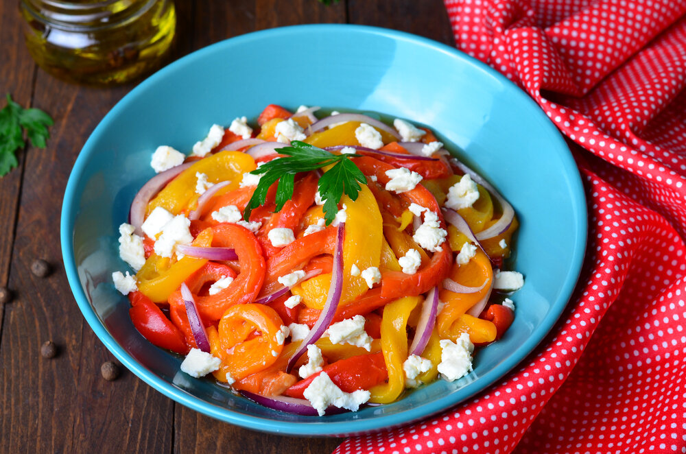 Многие даже в праздники следят за своим питанием и стараются в предновогодние и посленовогодние дни «налегать» преимущественно на овощи и фрукты. Для таких людей у нас есть несколько отличных рецептов овощных салатов на Новый Год, которые украсят любое праздничное меню. Впрочем, наличие овощей в салате не делает его автоматически легким и вегетарианским. Некоторые рецепты по своей сытности могут поспорить со вторыми блюдами. Мы постарались учесть интересы всех ваших гостей и предлагаем новогодние рецепты овощных салатов как для сторонников ЗОЖ, так и для «любителей майонеза». Салат с болгарским перцем и брынзой Салаты с использованием рассольных видов сыра стали довольно популярными у нас, благодаря своему необычному вкусу, полезности и сытности. Мы уверены, что наш рецепт овощного салата на Новый Год – с брынзой, перцем и «пекинкой» – постоянно пропишется в вашей кулинарной книге уже после первого приготовления. Ингредиенты Для приготовления этого блюда, претендующего на звание «диет