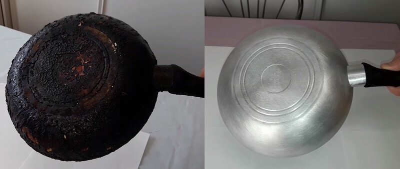 Окуните посуду в слегка прохладную воду. 10 таблеток угля измельчите и посыпьте на сковороду. Спустя час помойте изделие водой.