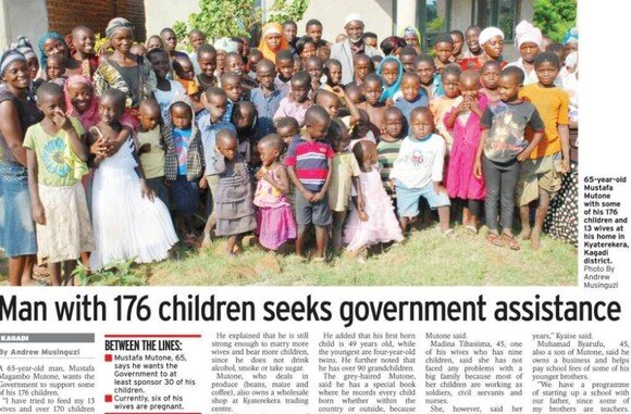 Мустафа Магамбо Мутоне, 66 лет, является самым продуктивным отцом в Африке. У мужчины есть семья из 176 детей, 13 супругов и не менее десяти любовниц. Младшему ребенку 49 лет, а самый младший - в ясли. С августа 2017 года мужчина взорвал правительство Уганды, чтобы предоставить ему социальное пособие для поддержки своей большой семьи, потому что у него больше нет такой возможности. Уже летом 2017 года Мустафа Магамбо Мутоне прилагает сверхчеловеческие усилия, чтобы убедить правительство оказать ему социальную поддержку для поддержки своей семьи. «Я прошу правительство спонсировать, по меньшей мере, 30 из моих детей в разных школах и социальных учреждениях», - сказал Мутоне, которого рекомендовали в качестве бизнесмена, базирующегося в Киатерекера, район Кагади. У него более 40 детей начальных школ и он хочет открыть собственное учебное заведение, где могут работать детские сады и начальная школа.