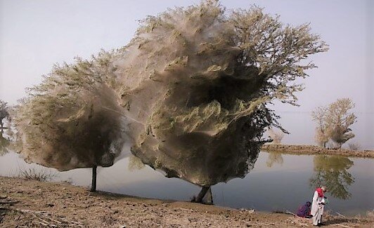 1.Деревья-коконы (Пакистан) Ужасающее явление произошло в Пакистане после наводнения. Дело в том, что пауки, спасаясь от потопа, перебрались на деревья. А на них...начали плести паутину! В итоге все кроны деревьев оказались словно в коконе. Несмотря на то, что проделки пауков сильно напугали местных жителей, это событие принесло с собой и плюсы: спасение от комаров, а потом и от малярии! 2. Биолюминесценция (Мальдивы) А это чудесное явление можно наблюдать ночью на острове Ваадху. Вода становится неоново-синего цвета и похоже на звездное небо! Такое невероятное свечение создают микроорганизмы в результате химической реакции. 3.разноцветные холмы (Китай) Геологический феномен в парке Данься уже долгое время привлекает туристов со всего мира. В результате передвижения земной коры, смещения разнообразных горных пород и ветра, здесь образовался уникальный разноцветный горный ландшафт. Кажется, что эти горы просто разрисовал художник! 4. Брайникл или “палец