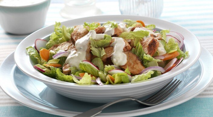 СОСТАВ ½ Стакана / 140 грамм простого греческого йогурта из цельного молока ⅓ Чашки / 40 грамм рассыпанного голубого сыра 1 столовая ложка лимонного 1 столовая ложка майонеза Половина чайной ложки сахарного-песка Половина чайной ложки острого перцового соуса Оливковое масло первого отжима Кошерная соль СОУС ⅓ Чашки / 80 миллилитров острого перцового соуса 2 чайные ложки сахарного-песка 4 обваленные, без шкуры половинки куриной грудки 1 чайная ложка паприки Половина чайной ложки свежего молотого черного перца 1 крупное сельдерея, нарезанное поперек тонкими ломтиками 1 крупную морковь нарезать поперек тонкими ломтиками 4 редиски, нарезанные поперек тонкими ломтиками Половина мелкого лука, нарезанного поперек тонкими ломтиками 2 столовые мелко нарезанного листья сельдерея Инструкции 1 В средней миске смешайте ингредиенты вилкой, включая 1 столовую ложку масла и половина чайной ложки соли. Охлаждать до необходимости. 2 В маленькой миске взбейте ингредиенты соуса. Зарезервируйте