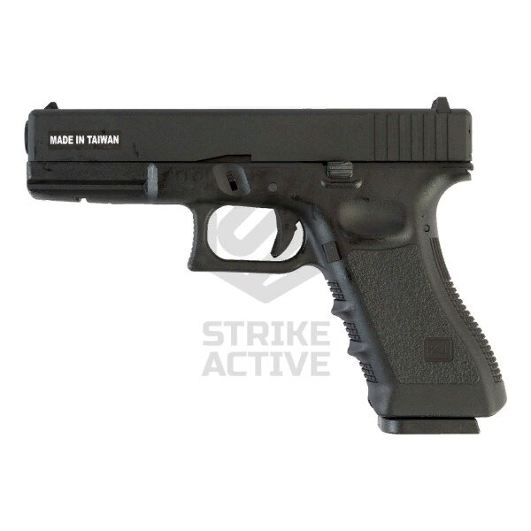 Достаточно точная и надежная страйкбольная копия пистолета Glock 17 от компании KJW, модель KP-17. Пистолет комплектуется магазином на CO2, но также совместим с магазинами на грингазе (Green Gas). Пистолет удобно лежит в руках, имеет средний, оптимальный размер для вторичного оружия. Снизу на раме пистолета есть планка для установки фонаря или ЛЦУ.