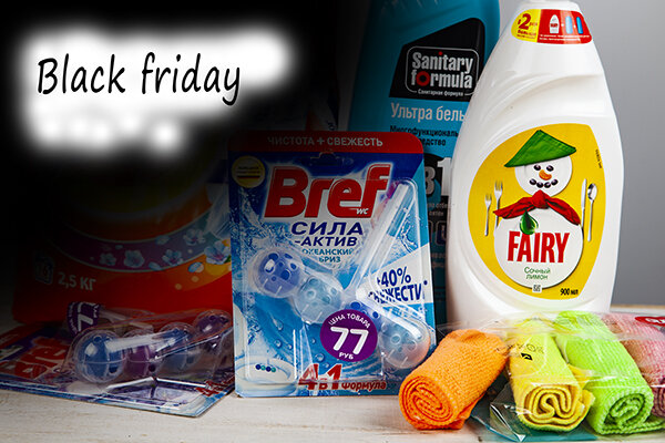 А тут еще и Черна пятница! На сайте обещали начислить на карту бонусы в тройном размере. Это я просто не смогла пропустить. Поэтому и набрала разных средств для стирки, уборки и прочих товаров для ежедневного пользования, раз уж другого ничего не приглянулось.
