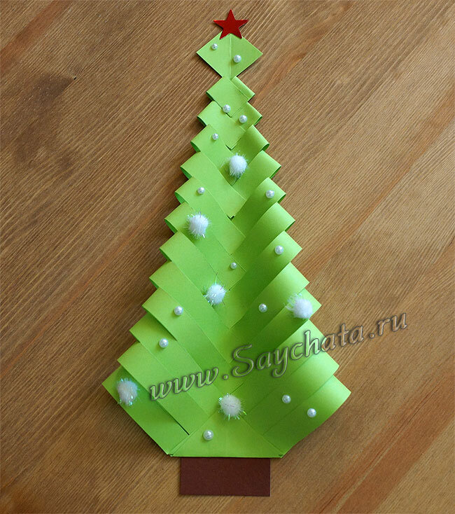 - Ну и всё! Осталось лишь приклеить ствол из коричневой бумаги и нашу новогоднюю ёлку украсить тем, что под руку попадется.