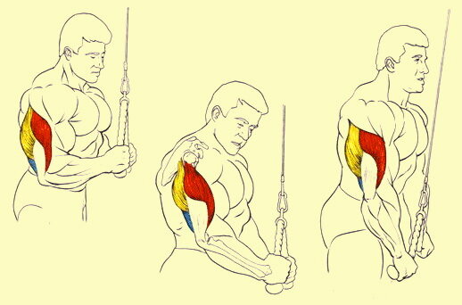 Как я "качал" трицепс в 70-80-е годы описано в заметке "Трицепс, трицепс ты могуч!". И в этот период упражнение "разгибание на трицепс на блоке" я почти не делал. Почему? Во-первых, не было удобных тренажеров, а во-вторых, мне было не удобно. Приходилось одевать пожарный ремень и пристегивать гири, чтобы меня не поднимало. В-третьих, те упражнения, которыми я тренировал трицепс, меня тогда полностью удовлетворяли. И только в начале 2000-х, когда появился дискомфорт в плече, пришлось отказаться от французского жима стоя. Потом реже стал отжиматься на брусьях. И последние пять лет я очень редко жму лежа. Но для поддержания хорошего тонуса в трицепсе я стал делать упражнение - трицепс на блоке. Очень удобное и нетравмоопасное упражнение. Плечи не испытывают дискомфорт. А большой нагрузкой включается хорошо широчайшая, удерживая локти у туловища. Вроде, все достаточно просто. Движение короткое, но часто вижу, как «некоторые» умудряются выполнять упражнение неправильно. Вы стоите напротив