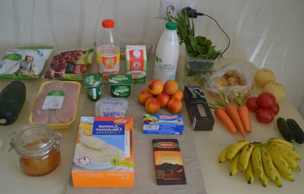 Сходила я сегодня в магазин за покупками. Решила закупиться заранее на неделю. Итак, что мне понадобится? · Крупы (чечевицу, горох -источник растительного белка, гречку - ну куда ж без гречки, смесь круп на завтрак - быстро и не затратно). Кстати, я люблю хлопья многозерновые. С утречка залил кипятком, умылся – уже каша готова. · Хлебцы. Я люблю Dr.Korner. · Яйца. Тут без комментариев. Только нужна сковородка с антипригарным покрытием, чтобы готовить их без масла. · Сыр. Советуют, конечно, с низким процентом жирности. Я нашла 45%. · Творог. · Кисломолочку покупаю ежедневно. · Овощи. Капуста, морковка, свекла (это уже салат щетка), кабачки. Эти овощи хороши тем, что долго хранятся и не особо дорогие. · Фрукты. Яблоки, мандарины (как же я их люблю!!! К тому же, мандарины – самые низкоколорийные фрукты) груши. Если что, потом докуплю. · Грудку. Она, конечно, особым вкусом не обладает, но в инете есть куча рецептов вкусной грудки. · Говядину. Мясо еще никто не отменял. · Рыбу м