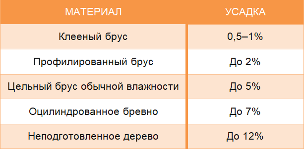 Усадка древесины и деревянных строений - естественный процесс уменьшения размеров стройматериала и, как следствие, высоты конструкций. Степень усадки зависит от используемой древесины, времени года строительства и размеров конструкции. Клееный брус имеет усадку не более одного процента или двух сантиметров на общую высоту сооружения из-за особой технологии изготовления, поэтому он стоит дороже обычного профилированного. К внутренней отделке можно приступать почти сразу после возведения стен. Брус естественной влажности дает усадку 5-8 см на три метра высоты. Оцилиндрованное бревно чуть больше - до 9 см, а неподготовленное дерево может давать 10-11 см усадки на те же 3 метра высоты. Усадка зависит от времени возведения В холодное время дерево сохнет медленнее и усадка будет проходить плавнее, чем летом, поэтому лучше всего строить дом ближе к зиме, к тому же "зимний лес" дешевле. А летом уже можно будет начать отделку, если это не большой массивный коттедж, ведь размеры тоже играют