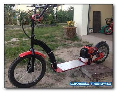 Самокат с бензиновым мотором, который развивает скорость до 30 км/ч – очень интересный агрегат, его своими руками собрал Андрей – мастер из Минска.