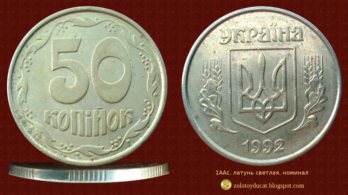 50 копеек 1992 года, Украина На самом деле, большинство пятидесяти-копеечных монет Украины 1992 года оцениваются коллекционерами в номинал. Но, среди 50-ти копеек дорого стоят пробные монеты, или не чеканившиеся в качестве официальных проб, а отчеканенные нелегально для заработка на коллекционерах, а так же монеты, выпущенные незначительным тиражом. Правда, попадаются в руки они очень редко.