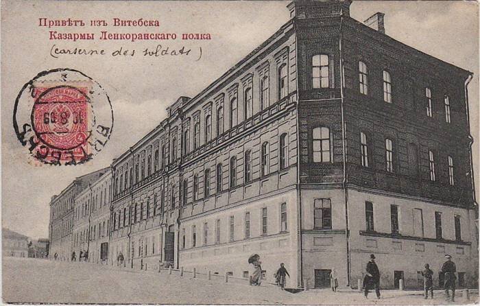 Здание казарм Ленкоранского полка на Гоголевской улице (улица Ленина, 16), где в 1910-1918 гг. размещался Витебский учительский институт. Фото конца ХIХ века. Источник: Витебская энциклопедия