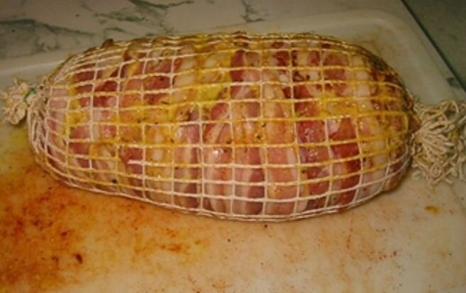 Ветчина домашняя – это всеми любимое мясное лакомство, которое всегда украсит ваш праздничный стол. Конечно, мясной деликатес можно купить в любом супермаркете, но вкус домашнего мяса не сравнится ни с чем. Наше домашнее мясное блюдо получается очень вкусным, ароматным и сочным. И главное – в нем нет консервантов, поэтому и съедается ветчина очень быстро! Ингредиенты Приготовление: Чеснок почистить и измельчить при помощи чеснокодавки. В ступке измельчаем лавровый лист и горошины перца (душистый, черный, белый, розовый). Хорошо растираем все ингредиенты до состояния однородной мелкой крошки. Затем добавляем соль и хорошо перемешиваем все специи между собой до образования однородной массы. Достаем свинину из морозильной камеры холодильника и размораживаем ее до комнатной температуры. Мясо промываем под теплой проточной водой. Затем хорошо просушиваем с помощью бумажного полотенца. Тщательно очищаем мякоть от жил, пленок или осколков костей. Затем равномерно и обильно со
