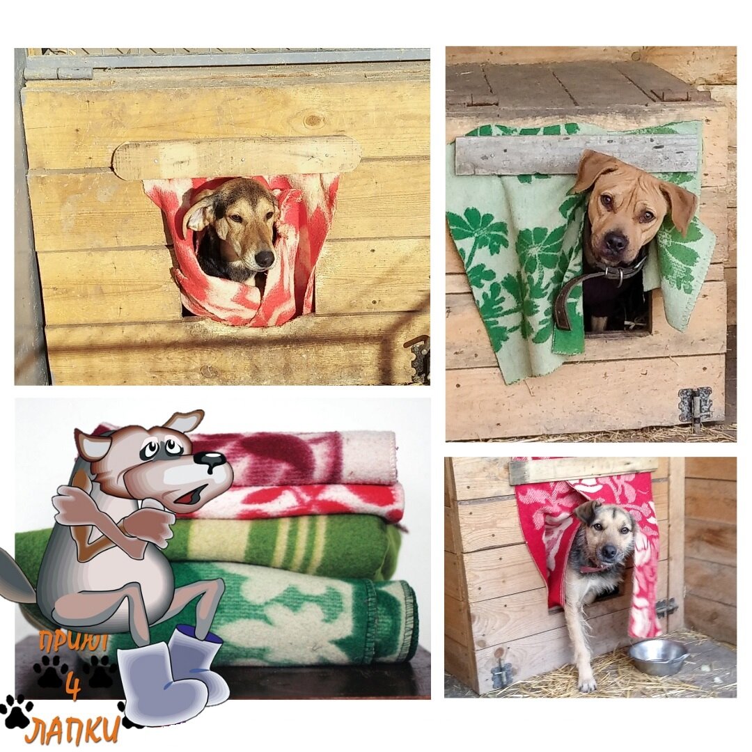 Для того, что бы сохранялось тепло в будке и не задувало, на все домики волонтеры крепят теплые шторки из старых одеял...