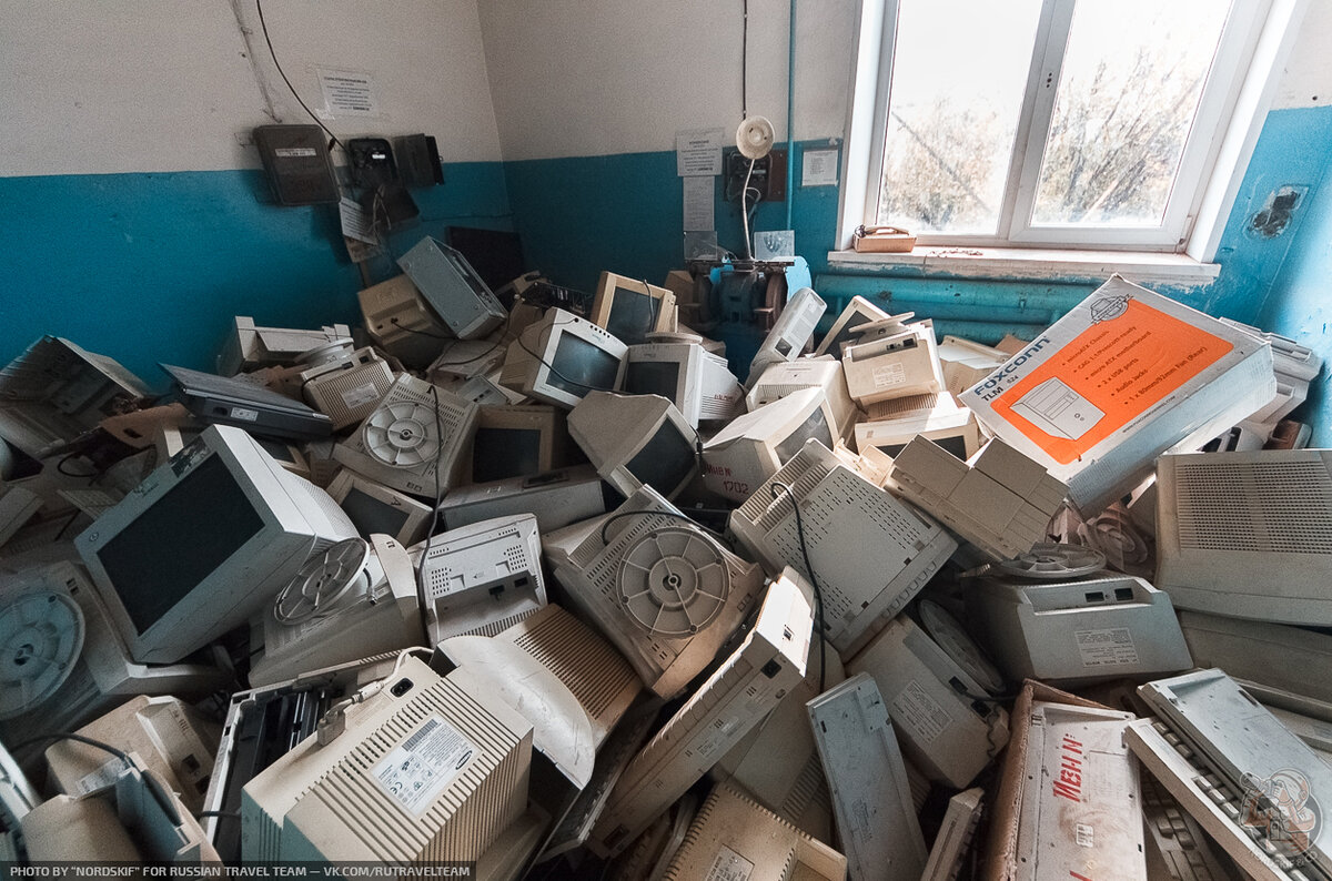 Всякого я повидал на заброшенных заводах! Многое остается не у дел. Станки, лабораторное оборудование, приборы,а порою даже автомобили... Но такое я видел впервые! А удивила меня целая гора из мониторов, системных блоков и разной оргтехники сваленная в одной единственной комнате. Тайная комната одного крупного заброшенного завода. Нет никакого понимания, почему вся эта электроника, пускай и сильно устаревшая была таким варварским образом складирована в одной единственной комнате. (а не оставлена на своих местах например) Спрашивается, зачем? Техники тут настолько много, что ей пришлось складывать в 2-3 слоя из-за чего все это напоминает огромную серую гору. Путешествия и экспедиции бывают разными. Кто-то находит удивительной красоты природные места, а кто-то, как мы находит чудеса человеческой расточительности. Мне конечно очень хочется верить, что сейчас каждый компьютерный класс, даже самой захолустной сельской школы имеет в своем распоряжении новые компьютеры с ЖК мониторами. Но, ес