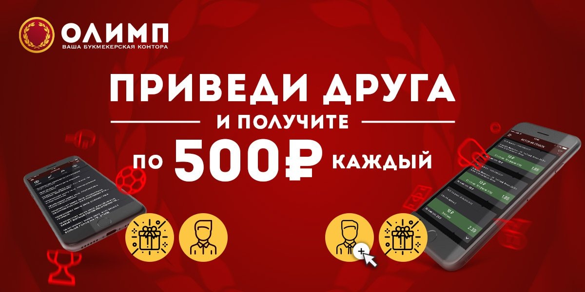Букмекерская компания «Олимп» предлагает гарантированный бонус за каждого приглашенного друга – фрибет в размере 500 рублей. Для получения фрибета: После этого каждый из вас получит по 500 рублей на бонусный счет. Кроме того, вы будете получать по 5% от каждого пополнения друга на свой счет. Используйте наш бонус код RF0WJAQA и получите свои 500 рублей на olimp.bet