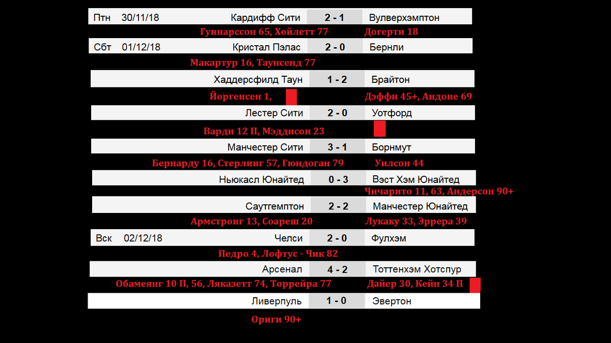 Привет всем. Результаты всех матчей 14 тура в Англии. 30 ноября Кардифф и Вулверхэмптон открывали игровую программу тура. Сколько же разбрелось по Европе исландцев. И в этой игре забил один из них – Гуннарссон. Ну, а победу хозяевам принес, вы удивитесь – канадец Хойлетт. Это стал 6-й тур, в котором Вулверхэмптону не удалось победить. Кристал Пэлас одолел дома Бёрнли - 2:0. Выделю Андроса Туансенда (Townsend), у него гол и голевая передача в игре. Кто владеет английским языком, попробуйте перевести его фамилию. Бёрнли превосходит серию Вулверхэмптона и не может победить уже в 7-м туре к ряду. Хаддерсфилд проигрывает Брайтону - 1:2. Хотя хозяева забили первыми уже на 1-й минуте. Но в середине первой половины, команда получает прямую красную. У Брайтона отметим игрока по фамилии Марч, у него 2-е голевые передачи. 1,5 месяца не побеждал Брайтон на выезде. Лестер выиграл у Уотфорда, тут тоже была красная, но она не сыграла значительной роли в матче, так как удаление произошло на 9