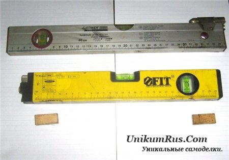 Займёмся изготовлением простейшего лазерного уровня. Для этого понадобится строительный уровень с 2мя-3мя пузырьками средней руки и детская лазерная указка.