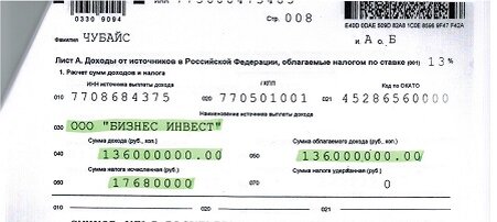 В результате этой первоначальной сделки (последующая будет еще круче), Анатолий Чубайс получил от своего товарища и партнера гражданина Минца прибыль не много ни мало аж в 378 миллионов рублей легальных, чистых денег, который благополучно внес в декларацию о доходах. Мол, просто купил землицы, а потом по случаю её перепродал, но уже в тринадцать раз дороже. Подтверждает эти чудеса легализации налоговая декларация Анатолия Борисовича за 2012 год, где указан доход в 136миллионов рублей: