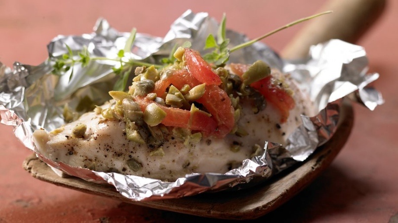 Ингредиенты, которые нам потребуются: 3 помидора (примерно 200 г) 2 шт филе куриной грудки (по 170 г каждое) 2 ч. ложки оливкового масла 40 г зеленых оливок без косточек 20 г каперсов соль, перец по вкусу 2 веточки свежего орегано (или сухого) 125 мл белого вина Процесс приготовления: 1. С помощью ножа (кончика) удаляем места, где прикреплены плодоножки помидоров погружаем помидоры на 10 - 15 секунд в кипящую воду. Затем достаем их и обдаем холодной водичкой и очищаем от кожицы. 2. Каждый томат разрезаем на 4 равные части и обрезаем мякоть, в которой находятся семена. Теперь нарезаем помидор на полоски. 3. Из баночки достаем каперсы и выкладываем их на сито, немного нужно подождать, пока вся жидкость стечет. Нарезаем оливки довольно крупными кусочками. 4. На ранее подготовленные 2 кусочка алюминиевой пищевой фольги (размером – 30х30 см) наливаем совсем немного оливкового масла – по 1 чайной ложке на каждый. 5. Затем промываем куриное мясо под проточной водой и обсушиваем с помощью бу