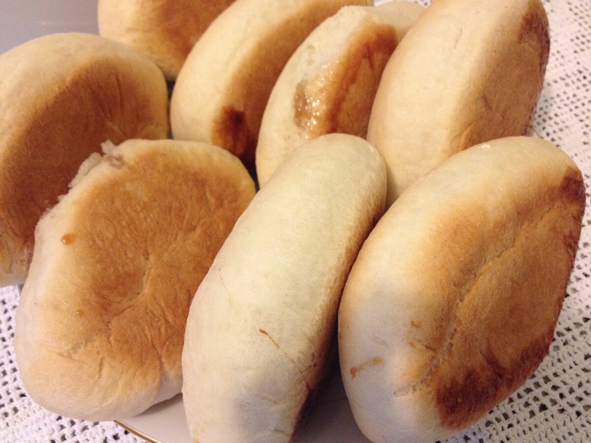 Яблочное варенье – 200 гр. В теплую воду добавляются по очереди дрожжи, сахар, соль, масло, просеивается мука. Замешивается мягкое тесто. Посуда с тестом накрывается пищевой пленкой, на 40 минут ставится в теплое место без сквозняков. Когда тесто поднимется, оно обминается и выкладывается на посыпанный мукой стол. Разрезается на 8 одинаковых кусочков. Каждый кусочек скатывается в шарик. Шарики раскатываются скалкой в круглые лепешки. На середину леп