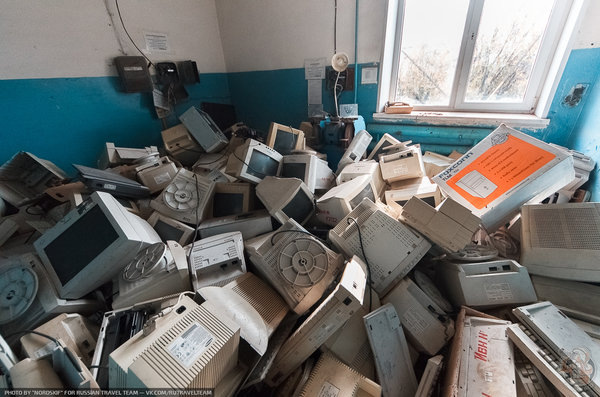 Всякого я повидал на заброшенных заводах! Многое остается не у дел. Станки, лабораторное оборудование, приборы,а порою даже автомобили... Но такое я видел впервые! А удивила меня целая гора из мониторов, системных блоков и разной оргтехники сваленная в одной единственной комнате. Тайная комната одного крупного заброшенного завода. Нет никакого понимания, почему вся эта электроника, пускай и сильно устаревшая была таким варварским образом складирована в одной единственной комнате. (а не оставлена на своих местах например) Спрашивается, зачем? Техники тут настолько много, что ей пришлось складывать в 2-3 слоя из-за чего все это напоминает огромную серую гору. Путешествия и экспедиции бывают разными. Кто-то находит удивительной красоты природные места, а кто-то, как мы находит чудеса человеческой расточительности. Мне конечно очень хочется верить, что сейчас каждый компьютерный класс, даже самой захолустной сельской школы имеет в своем распоряжении новые компьютеры с ЖК мониторами. Но,