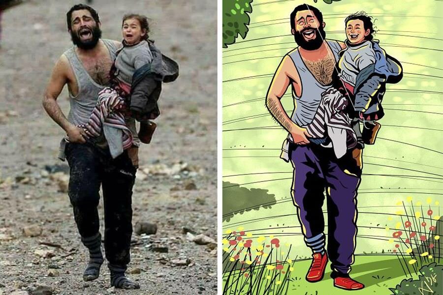 Превращение трагедий в счастливые моменты Художник из Бангладеш Мошед Мишу начал художественный проект «Всемирный марафон счастья»: он перерисовывает страшные и трагические фотографии из лент новостных агентств, несколькими штрихами превращая их в картины счастья, радости и беззаботности. По словам художника, таким образом он хотел привлечь внимание к тому, каким прекрасным был бы наш мир, если бы удалось искоренить зло, насилие и войны. Источник: «Халабалу» - интересные факты со всего света.
