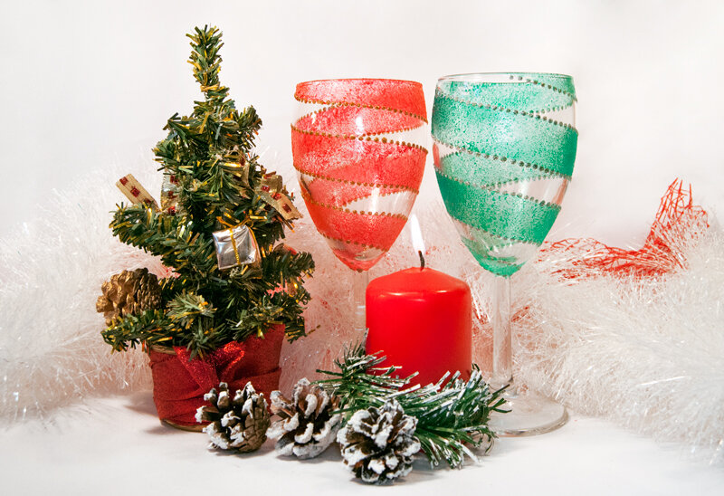 Бокалы являются важной частью сервировки новогоднего стола. Сегодня задекорируем пару весёлых бокалов для шампанского, которое будем пить под бой курантов. Экспресс-декор предполагает минимум материалов и времени, но качественный и эффектный результат. Создайте праздничную атмосферу своими руками и удивите гостей своим талантом! :) Для экспресс-декора стеклянных бокалов нам понадобятся: • моделирующие гели (мы выбрали цветные, но можно поэкспериментировать и с «Хамелеонами»); • контуры с блёстками «Глиттеры»; • малярный скотч, пластиковая палитра, поролоновая губка. Первым делом обезжирим поверхность бокала салфеткой, смоченной жидкостью для мытья окон, спиртом или ацетоном. Затем приступим к декорированию. Для создания рисунка с чётким краем делаем маску при помощи малярного скотча. Липкую ленту цепляем за край бокала и немного натягивая, приклеиваем её по кругу, получая спираль.Следим, чтобы линии были под одинаковым углом наклона и параллельны друг другу,насколько это позволяет форм