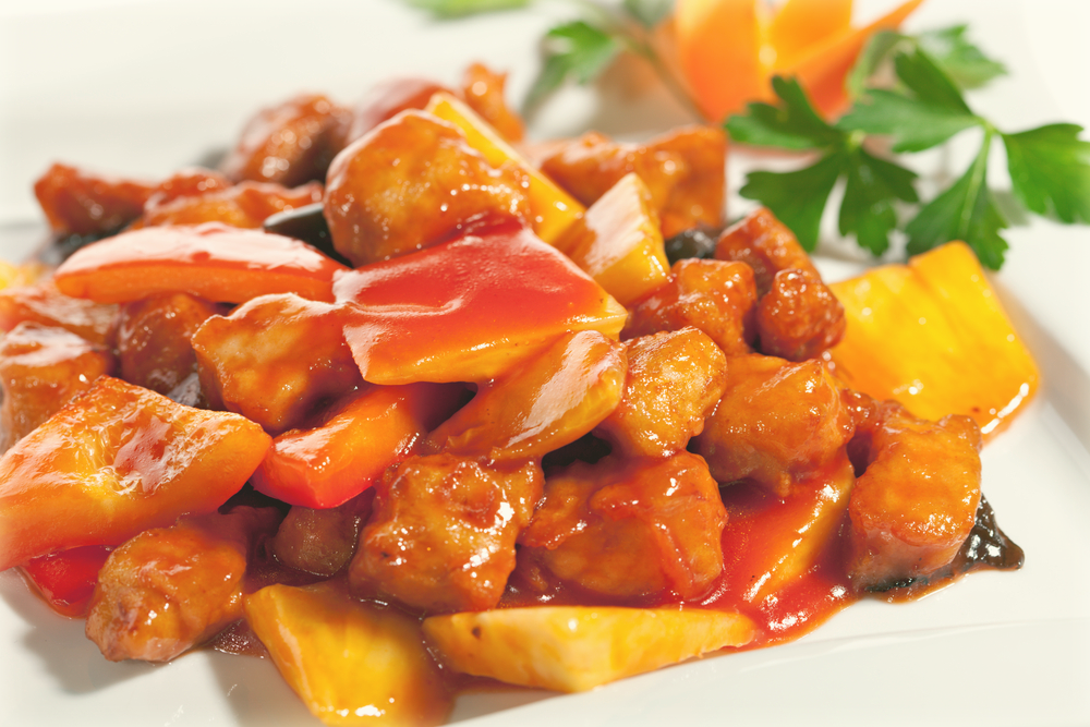 С помощью пикантного соуса обыкновенная куриная грудка заиграет новыми вкусами. Сладко-острый вкус не оставит равнодушным гурманов. Для курочки нам понадобится: 500 г куриного филе 10 столовых ложек соевого соуса 8 столовых ложек яблочного уксуса 1/2 стакана воды 2 столовых ложки томатной пасты 1 болгарский перец 1 стакан консервированных ананасов, нарезанных кубиком 2 помидора сахар по вкусу Куриное филе промываем, нарезаем кубиком и складываем в миску. Добавляем 6 столовых ложек соевого соуса, перчим оставляем мариноваться. Перец нарезаем соломкой, помидоры кубиком. Смешиваем в сковороде уксус, оставшийся соевый соус и томатную пасту. Нагреваем и добавляем немного сахара.Вливаем воду, добавляем помидоры, болгарский перец и ананасы. Тушим на малом огне 10 минут. Замаринованную курицу обжариваем на отдельной сковороде, добавляем к соусу и тушим еще 10 минут. Готовую курицу можно подавать как с рисом в качестве основного блюда, так и отдельно как закуску. Приятного аппетита!