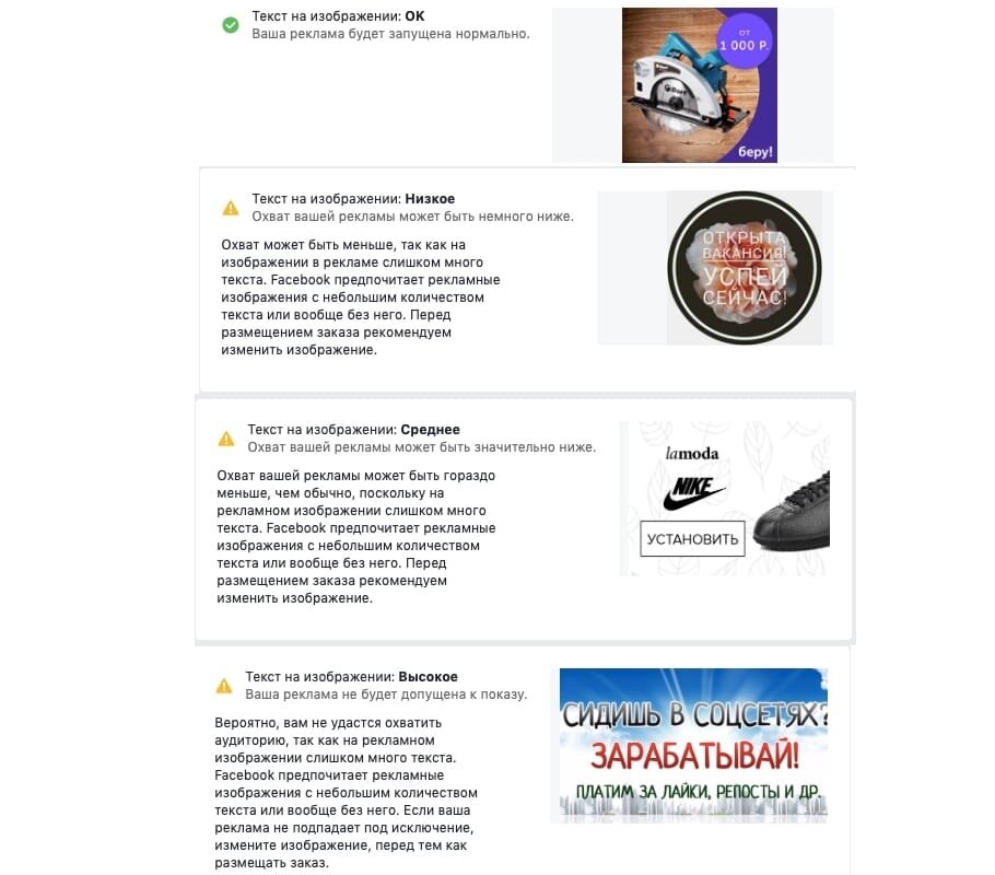 Чтобы проверить изображение на совместимость, используйте специальный инструмент Facebook “Проверка текста на изображении”
