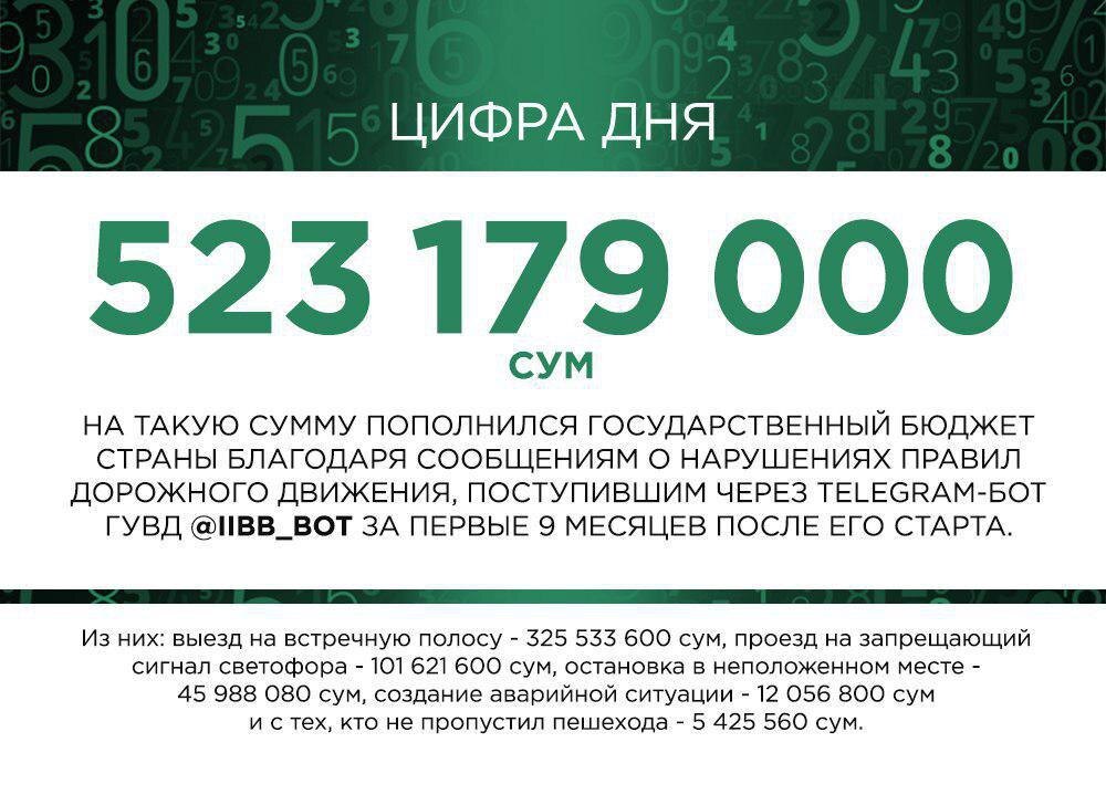 Узбекистан, Ташкент - АН Podrobno.uz. ГУВД взыскало штрафы более чем на 523 миллиона сумов по видео и фотофактам нарушений ПДД, присланным жителями столицы, сообщает корреспондент Podrobno.uz. Больше всего штрафов было собрано за выезд на встречную полосу – 325,5 миллиона сумов, проезд на запрещающий сигнал светофора – 101,6 миллиона сумов, остановку в неположенном месте – 45,9 миллиона сумов, создание аварийной ситуации – 12 миллионов сумов, не пропуск пешеходов – 5,4 миллиона сумов. Напомним, что Telegram-бот @iibb_bot был запущен в апреле этого года. Для авторизации вам необходимо ввести свой номер телефона, выбрать язык – узбекский или русский, указать район проживания или места происшествия. Затем вы можете направить обращения, касающиеся деятельности УБДД, службы миграции и оформления гражданства, инспектора профилактики и прочих служб, при необходимости прикрепив к сообщению файл в аудио-, видеоформате или фотографию. Напомним, что в Узбекистане с 1 июля 2019 года будет внедре
