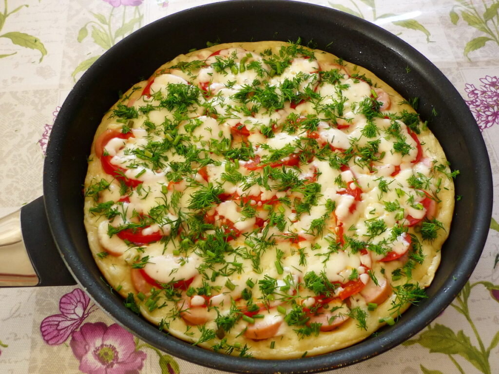 Кто из нас не любит домашнюю пиццу? Я люблю, хотя ненавижу делать тесто для пиццы и ждать, пока она поднимется. Поэтому я решила сделать пиццу без дрожжей ... на сковороде. Она очень нам всем понравилась. Ингредиенты Тесто (на две порции!) мука пшеничная 2 стакана Яйцо 2 шт. Соль пол чайной ложки Молоко 250 грамм Масло 200 грамм Холодная вода, 100 грамм Дополнительно: Кетчуп травы (орегано, травы прованса, базилик) любимые добавки ( у меня в одной версии с колбасой , луком, ветчиной и сыром , в другой ветчина и сыр). 1. Берем тесто , если очень липнет к рукам намочите