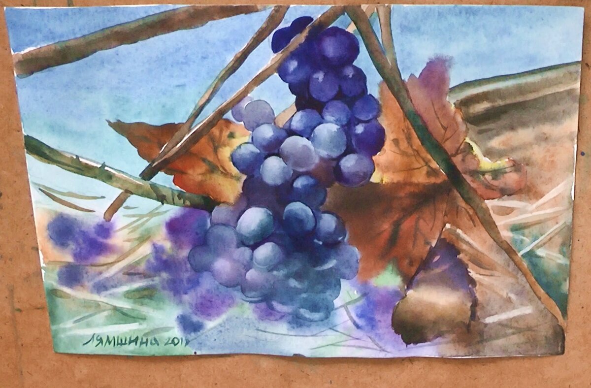 Я расскажу, как нарисовать гроздь темного винограда, используя одновременно две кисти. Инструменты и материалы: 1. Нам нужны круглые мягкие кисти №2, №4 (или №6). 2. Акварельные краски. 3. Палитра. Лучше всего подойдет обычная керамическая тарелка или керамическая плитка. 4. Акварельная бумага. 5. Салфетки или тряпочка. Прежде всего нужно создать цветную подложку. Для винограда в последствии это будут самые светлые места. Возьмите большую кисть №4 или №6. Закрасьте весь силуэт грозди серо-сиреневым цветом, можно вмешивать оттенки голубого и немного сине-зеленого. Пусть заливка высохнет полностью. Возьмите темные синие, фиолетовые оттенки. Закрасьте несколько ягод. Пока краска еще окончательно не высохла, возьмите вторую кисть №2 или №3. Кисть должна быть чистой и немного влажной. Избыток влаги убирайте о салфетку или ткань. Это кисточкой промокните краску внутри ягоды винограда. Краска впитается в чистую кисть, и на ягоде покажется цвет подложки. Поскольку краска еще не высохла
