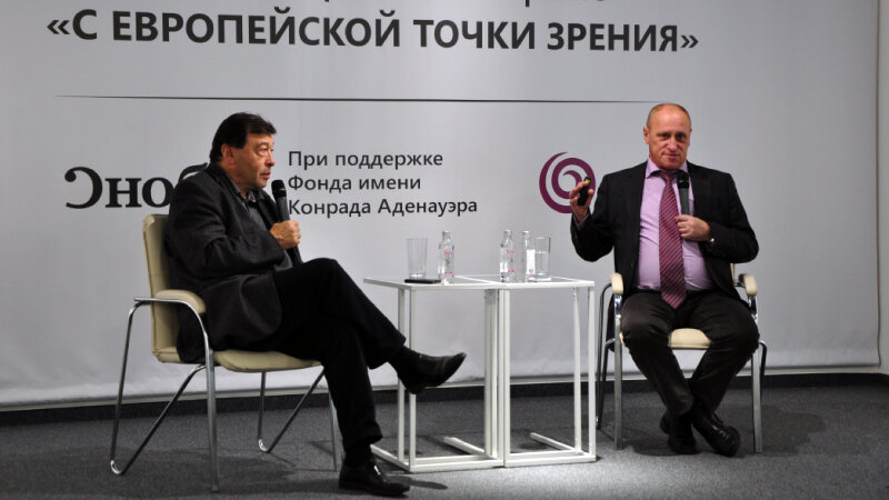 25 октября в Центре «Благосфера» состоялось открытое интервью члена Экспертной группы «Европейский диалог» Евгения Гонтмахерас деканом Экономического факультета МГУ Александром Аузаном. Мероприятие стало вторым в цикле дискуссий «С Европейской точки зрения», который организует Экспертная группа «Европейский диалог» при поддержке Фонда Конрада Аденауэра в России. Следующая встреча этого цикла пройдет 23 ноября. Приглашенным гостем будет Ирина Прохорова, главный редактор издательского дома «Новое литературное обозрение».