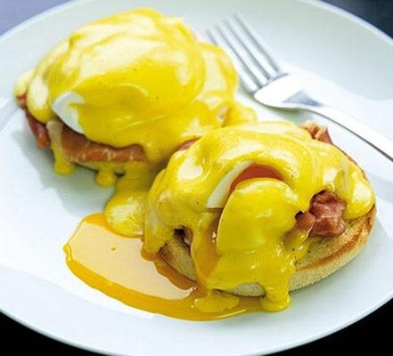 - На обжаренную половинку булочки кладём пару кусочков карбонада, сверху выкладываем яйцо пашот и всё это поливаем голландским соусом.