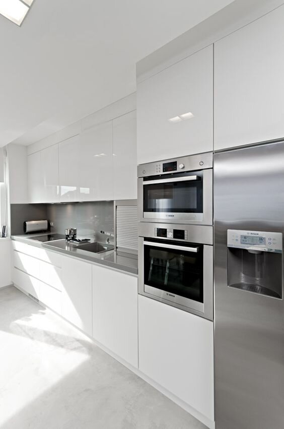 Бытует мнение, что белый цвет на кухне опасен. Многие убеждены — белая кухня непрактична и её нужно часто мыть, хотя мыть нужно абсолютно любую кухню! Как сохранить красивый внешний вид белой кухни? Рассказываем! 1. Покрытие Глянец всегда выглядит красиво и актуально. Лаконичный дизайн и светлый цвет зрительно увеличивают пространство и наполняют его воздухом. В случае с глянцевыми фасадами поверхность должна быть идеальной, шагрень и неровные кромки неприемлемы, иначе все отражения будут только подчеркивать неаккуратное исполнение. 2. Материал Белую кухню лучше делать в МДФ под эмалью, в этом случае не грозит скорое проявление желтизны и потеря блеска, как в ПВХ пленке. Чтобы защитить МДФ от внешних воздействий и продлить срок службы — новую кухню можно обработать полиролью для мебели с воском. 3. Ручки Гладкие фасады выглядят красиво без ручек, но в целях экономии и практичности можно выбрать интегрированные ручки в цвет кухни или подходящие под фурнитуру. На нижнем ярусе кухн