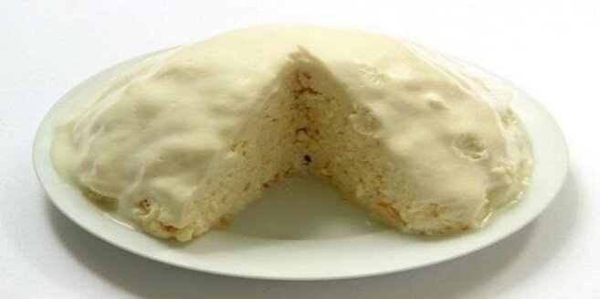 Для крема взбить миксером половину стакана сметаны с половиной стакана сахара. Выложить крем на вершину горки из творожной массы. Поставить торт в холодильник, чтобы крем застыл. Приятного аппетита!