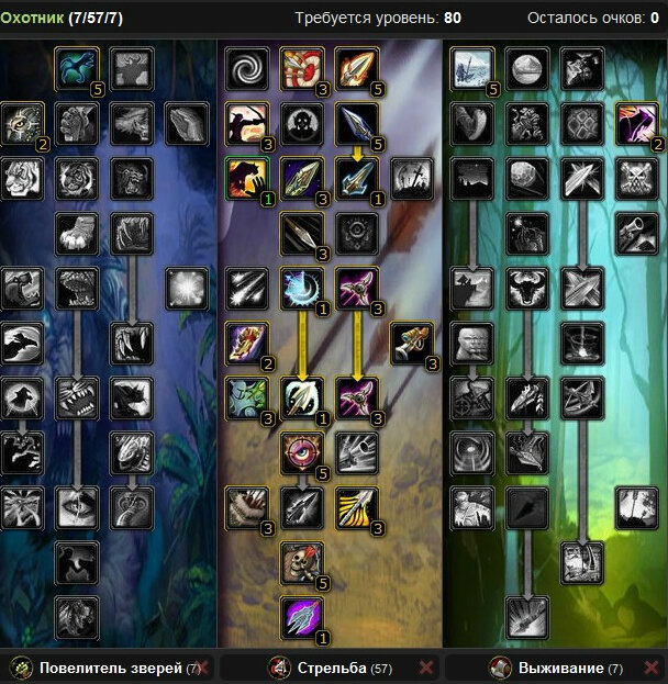 Есть несколько вариантов того, как можно расставить таланты. Всё зависит от того, за какую расу вы решили играть. Если вы начали играеть за Альянс, то такой талант как точное наведение можно не использовать, а взять лучше улучшенную метку охотника. При игре за Орду, такой талант, как точное наведение, вам будет просто необходим, ибо в топ игре замечается значительная недостача меткости.