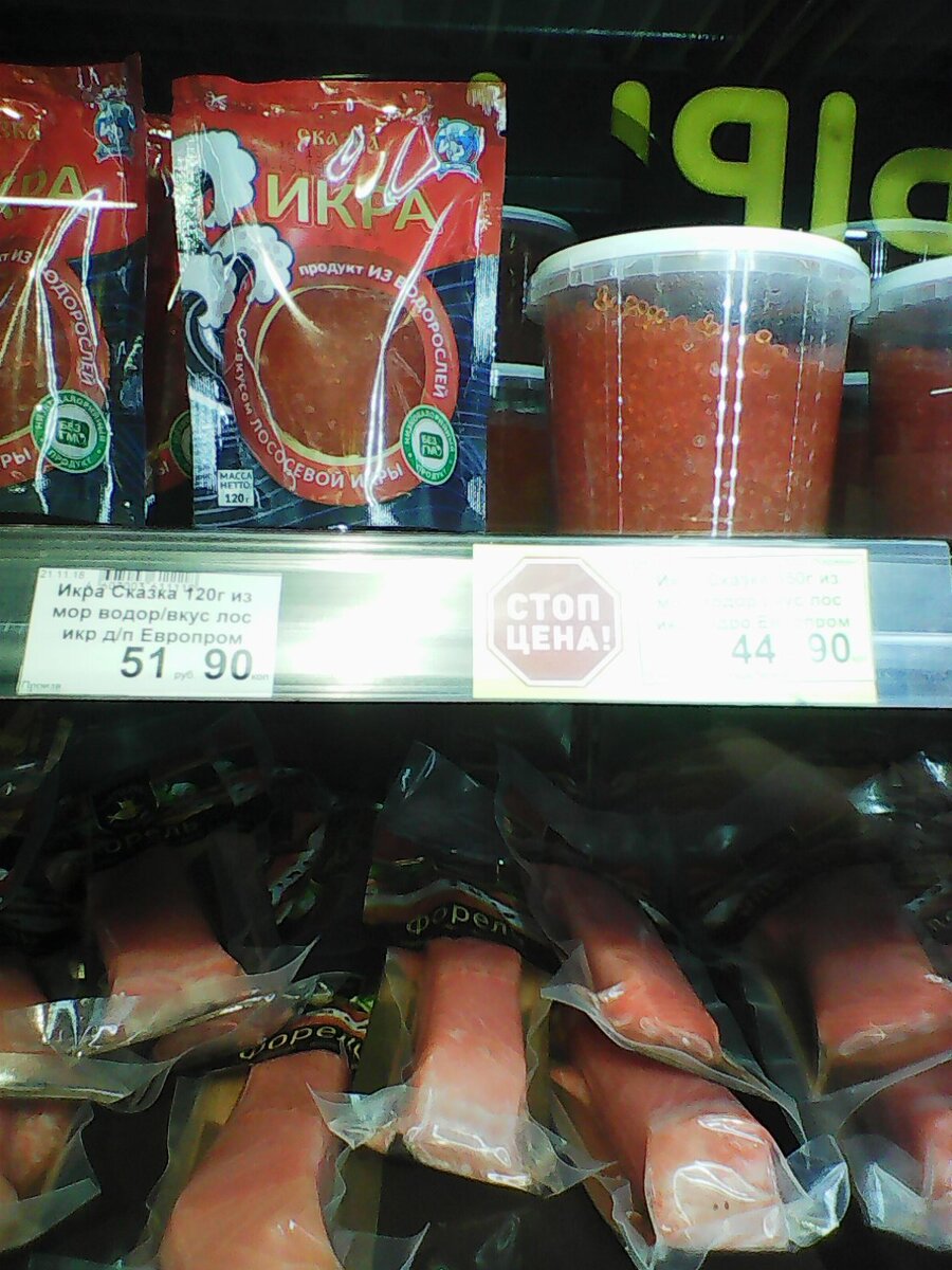 Осторожно! Не покупайте подделку!Сегодня нашел настоящую "сестру" той самой "икры" за 140 рублей за 140гр. Для тех,кто не читал,часть 1 и часть 2,прочитайте чтобы стало все понятно. Зашел в в местный супермаркет и увидел по акции "Икру",всего 45 рублей за 450 грамм.Только здесь все по честному Так и написано: "продукт из водорослей со вкусом лососевой икры".Ни какого обмана! Внутри выглядит ,как настоящая! Рядом есть и "черная икра",в разы дешевле икры сельди... Провел то же опытный эксперимент(как и в прошлой статье).Залил кипятком.Что видим? Для сравнения повторю фото из прошлой статьи.Две чашки практически одинаковые.Не побелели(как настоящая икра) и стал выделяться оранжевый краситель. Смотрим внимательно состав: натуральный рыбный бульон,экстракты бурых и красных водорослей далее полный набор того,чего не очень рекомендуется употреблять в пищу. В данном случае я не против,люди покупают.Раз все согласно ГОСТам и ТУ.значит продукт "безопасный " для здоровья. Удивляет только