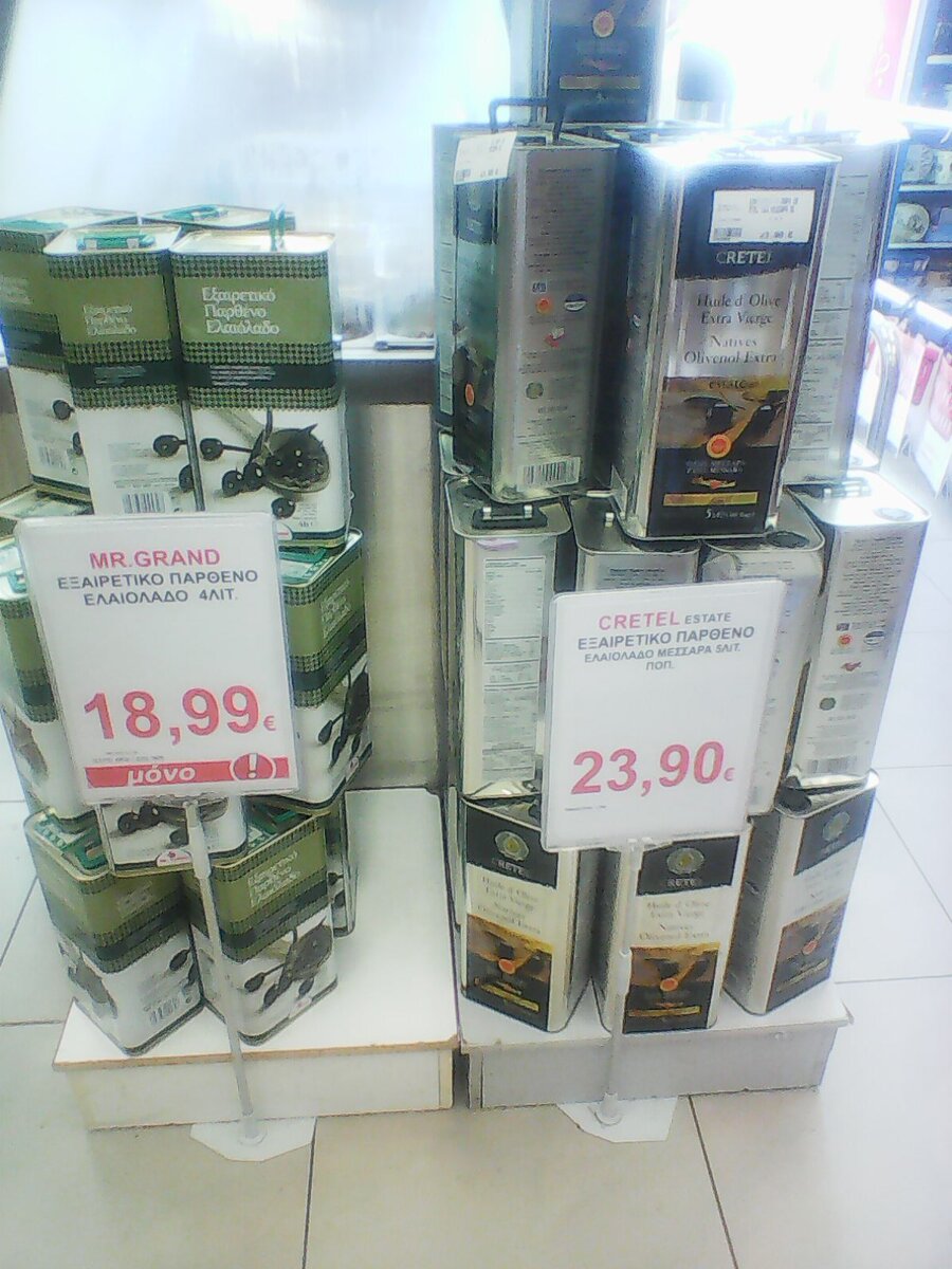 Несколько сравнений(август 2018года) Начну с греческого оливкового масло,цена на фото не за литр ,а за большую жестяную банку.Мы покупали пятилитровую примерно за 22 евро(1700 рублей) Почитайте:Что привезти из Греции: настоящее оливковое масло и как правильно выбрать Пиво можно купить "жестянку" до 1 евро.Вода 6 шт. 100-120 рублей.вполне адекватные цены. Сувенирные магнитики по 50 евроцентов. Видел даже за 1 евро -три штуки!(по 25 рублей за штуку) Красивые сувенирные кораблики! Самая знаменитая греческая Метакса от 10 евро(750 рублей) за бутылку,в зависимости от выдержки Вино на разлив 3 евро(220 рублей)-1 литр,хоть полусладкое ,хоть белое Сыры От 5-6 евро(от 400 рублей) , цены сопоставимы с нашими. Мясо (свинина) от 300 рублей(4 евро) и до 700 рублей говядина (вырезка) Фрукты,самые дешевые местные персики и нектарины по 1 евро(75 рублей) за 1кг. Яблоки и груши дороговатые,не знаю почему...Скорее всего польские. Выборку сделал не большую,но общий уровень цен понятен.Вполн