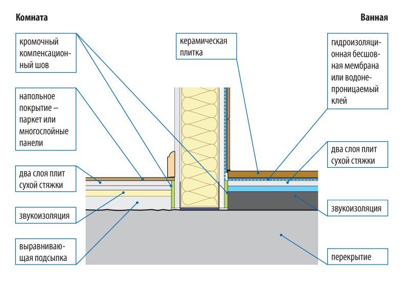 Вверху на рисунке показаны варианты соединения плавающего пола ванной (справа) и комнаты (слева) с гипсокартонной перегородкой.