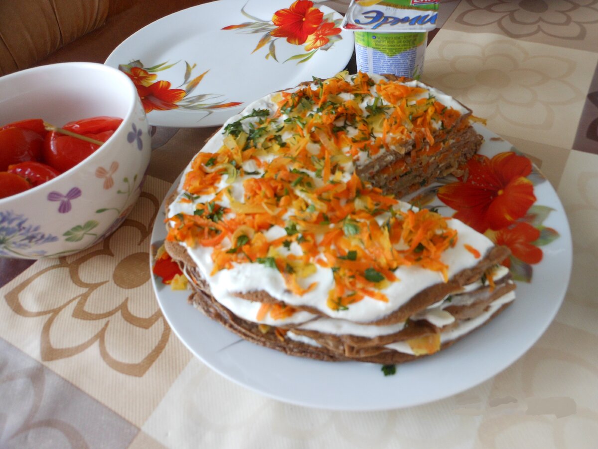 Мой рецепт пригодится всем, кто придерживается основ правильного питания (ПП), диеты Дюкана (ДД) и просто следит за количеством потребляемых калорий. Печеночный торт – это отличная закуска к праздничному столу. Его подают холодным, украсив зеленью. Торт готовят заранее – он должен постоять в холодильнике 8-10 часов в посуде с крышкой и пропитаться. Время приготовления – 45-60 минут. Какие понадобятся ингредиенты? Для приготовления вкуснейшего, сочного печеночного торта вам понадобятся следующие продукты: · печень (куриная, говяжья, свиная – все зависит лишь от ваших предпочтений) – 1.5 кг; · диетический майонез (15%), маложирная сметана или мягкий обезжиренный творожок (для сидящих на ДД) – 1 упаковка; · овсяные отруби – 3 больших ложки с горой; · яйца куриные сырые – 2 шт.; · морковь свежая – 3 больших корнеплода; · лук репчатый белый – 3 больших головки; · зелень любая – большой пучок; · чеснок – 3-4 зубка; · растительное масло – 3 ложки; · соль, перец, прованские травы – по вкусу
