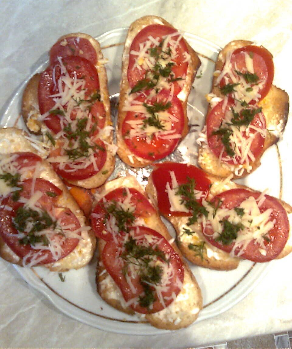 Простейший рецепт этих бутербродов меня выручал, когда подруга звонит и говорит я у тебя скоро буду)) Итак само приготовление: Белый нарезной батон плотные помидоры твердый сыр чеснок зелень майонез (или без него) соль Нарезаем батон. В тостернице поджариваем ломти батона (или на сковороде под крышкой с добавлением несколько капель растительного масла с двух сторон). Натираем хлеб чесноком с солью, намазываем тонким слоем майонез, сверху кладем дольки помидор, посыпаем натертым сыром и зеленью. Все очень быстро и мало затратно по времени и себестоимости. БЛАГОДАРЮ ЗА ПРОЧТЕНИЕ МОЕГО РЕЦЕПТА. БУДУ ПРИЗНАТЕЛЬНА ЗА ПОДПИСКУ НА МОЙ КАНАЛ И ЛАЙКИ.