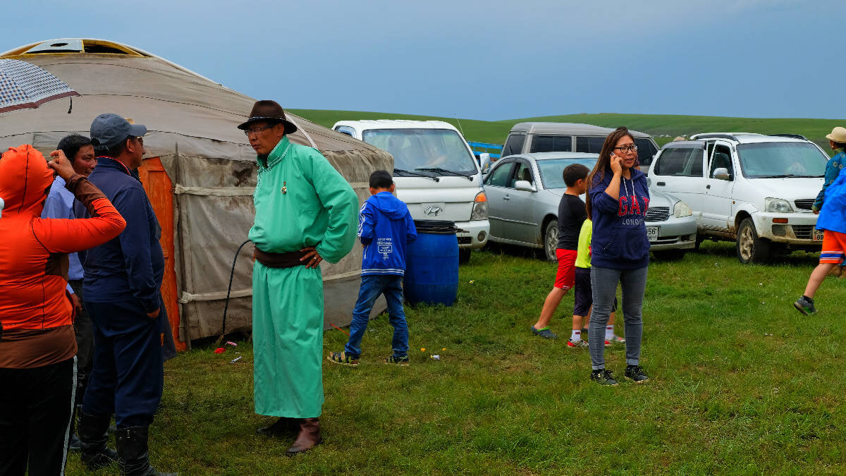 Уже более 2 тыс. км.по Монголии позади и мы подъезжаем к древней столице Каракорум (на указателях и в картах он везде называется Хорохорин). Дорога в этих местах хорошая, машин не много, а виды шикарные, поэтому двигаемся с остановками на фото и созерцание окружающих дорогу живописных ландшафтов. Вдруг, видим на горе скопление людей, машин, мотоциклов. А по проселочной дороге их сторону двигаются еще автомобили. Однозначно - там, что-то интересное происходит, и нам туда. Недолго думая, сворачиваем с асфальтированной дороги и двигаемся в гору. Машин действительно много, стоят шатры, юрты. Много людей в традиционных одеждах, но пока ничего не происходит. Попыталась узнать, что сие означает - может праздник какой. Но никто не говорит не по-английски, не по-русски. А из туристов только мы трое. На нас практически никто не обращает внимания, все заняты приготовлениями к чему-то и общением друг с другом. Мимо двигаются дети на конях. Причем, как мальчики, так и девочки отличные наездники.