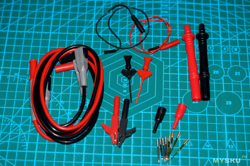 Всем привет. Ковыряясь с очередной поделкой я вдруг осознал, что мне очень нужны щупы — иголочки. Как оказалось этих иголочек полно, но все они представлены в виде насадок к щупам, при чем мои для этих целей не подходили. Пришлось искать щупы и тут снова куча вариантов, от 3$ «соплей» до 50$ за силикон. Последние мне очень понравились, но жаба ткнула пальцем в 10 долларовую модель. Ну да ладно, я же за иголочками полез, пойдет и так. «А это что? Это можно не снимая изоляции вешать на провода? 6 долларов?» Хомяк, отстань, я хотел иголочек… Под катом 3 лота… Начну с щупов, остальное буду докидывать по ходу обзора. Характеристик не было, только перечисление комплекта. Среди множества моделей остановился на P1300C, т.к. где-то в форуме писали, что они действительно держат 20 Ампер нагрузки. У меня нет амперметра на 20А, но решил, что двойной запас по мощности лишним не будет при разнице цены в 2 доллара. Весь комплект выглядит так Основные провода имеют с двух сторон «banana» коннекторы В