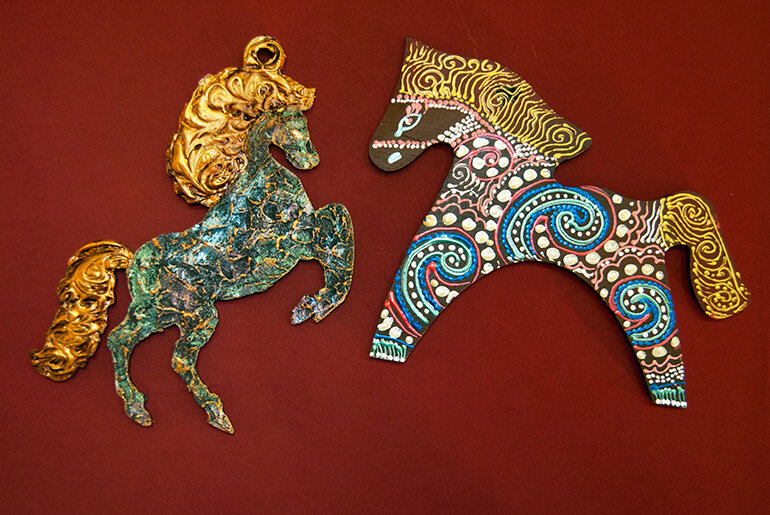Теперь декорируем высохшую пасту. Начнем с гривы, для этого покрываем ее сначала золотой краской, а потом на высохшую краску наносим битумный лак. Он достаточно жидкий, растекается по поверхности и заполняет все вп