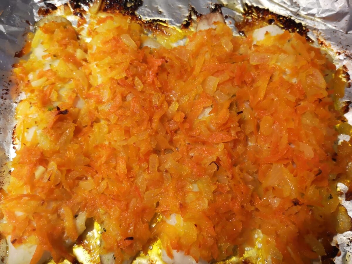 лук репчатый 1 большая луковица ПРИГОТОВЛЕНИЕ: Филе рыбы натереть солью и специями, в форму для запекания положить лист фольги смазанный растительным маслом. Под филе можно положить тонкие дольки нарезанного лимона. На филе сверху раскладываем слегка пассированный на растительном масле, лук и морковь. прикрываем фольгой. В конце готовки открыть на 5 минут. Ставим в духовку. Рыба готовится очень быстро. Вместо лука и моркови, можно просто рыбу обмазать малонезом (майонезом), в конце готовки посыпать тертым сыром. БУДУ БЛАГОДАРНА ЗА ПОДПИСКУ НА МОЙ КАНАЛ И ПОДДЕРЖКУ ЛАЙКОМ.
