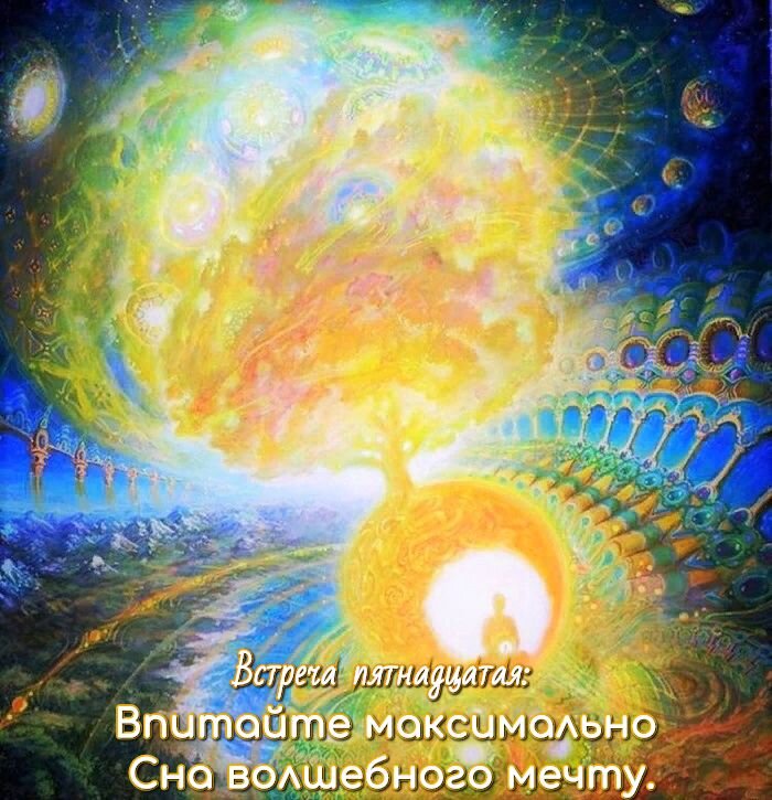 Теперь мы просим Вас расслабиться и насладиться нашими энергиями Снов волшебных, Солнечных. Сознание раскройте, отпустите мысли, прочувствуйте тепло, спокойствие, энергию, уют такой, какой бывает только дома, словно Вы под пледом мягким, свернувшись так, как Вам уютно и сердце Ваше открывается навстречу потоку мягкому и тёплому, родному. И Ваше тело расслабляется, впуская в подсознание ту давнюю мечту, которую уже почти забыли. Сейчас она становится всё ярче, всё реальней. И вот Вы погружаетесь в неё, она уносит Вас на крыльях сладких Снов и Вы стремитесь дальше, выше. Вы в сердце чувствуете мягкий жар, бывает так перед прыжком. Себя Вы не держите, смелей вперёд идите, прыгайте в мечту свою!